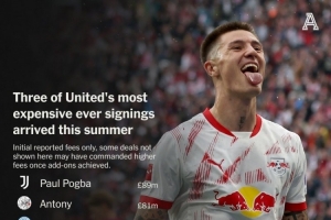 體育資訊8月9日訊 媒體TA統(tǒng)計了曼聯(lián)引援的轉(zhuǎn)會費,并列出榜單,博格巴8900萬英鎊居首,安東尼次席,前10名球員中有3人是在今夏加盟。