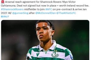 體育資訊08月24日訊 TA名記David Ornstein報(bào)道,阿森納從愛(ài)爾蘭球隊(duì)沙姆洛克流浪引進(jìn) 16歲中場(chǎng)奧日安武納達(dá)協(xié)議,2027年1月正式加盟。